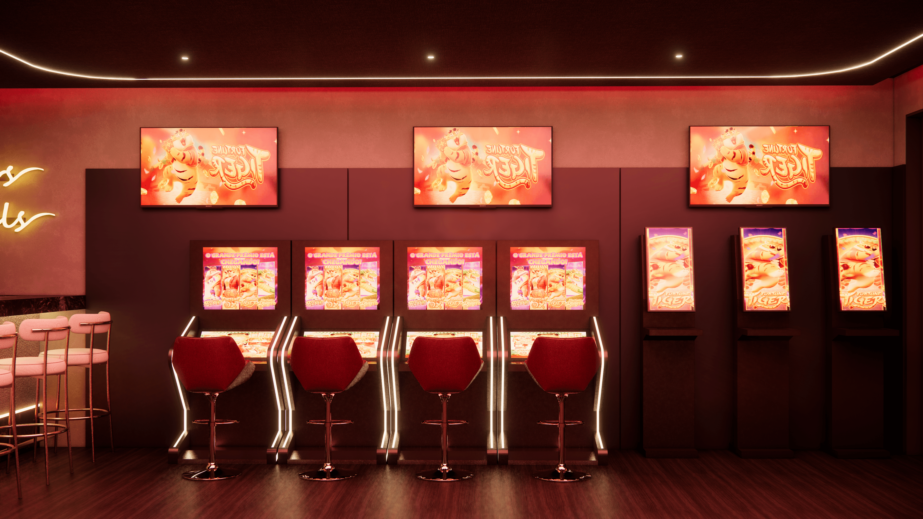 Essa loja comporta múltiplos totens, cadeiras confortáveis, painel de TV e espaço de circulação. O cliente joga e permanece por mais tempo.